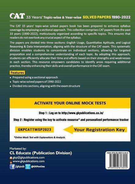 The CAT 33 years' topic-wise solved papers book has been prepared to enhance syllabus coverage by employing a sectional approach. This collection comprises CAT papers from the past 33 years (1990-2022), meticulously organized according to specific topics. This ensures that readers do not overlook any crucial aspect of the syllabus. The papers are divided into three sections: English Usage, Quantitative Aptitude, and Logical Reasoning & Data Interpretation, aligning with the structure of the CAT exam. This systematic division enables students to concentrate on individual sections, allowing for targeted preparation and a comprehensive understanding of each topic. By adopting this approach, students can efficiently allocate their time and efforts based on their strengths and weaknesses in each section. This resource empowers candidates to identify areas requiring additional practice, thereby enhancing their skills and overall performance in the CAT exam. Features: Prepared using a sectional approach Topic-wise solved papers of 1990-2022 Divided into sections, aligning with the exam structure