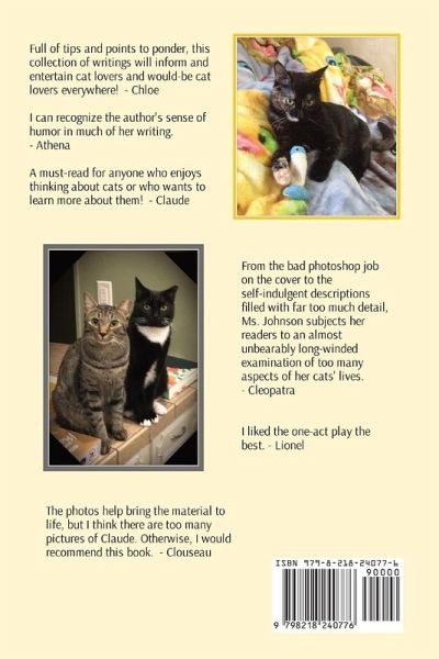 This collection of writings aims to entertain and educate the reader about cats, using the author's experiences with both feral and domesticated cats. Filled with photos, it includes the story of caring for and then relocating a feral cat colony along with many stories about individual cats and musings on cats and the nature of reality. It also includes tips for working with cats. There are bonus features such as a one-act play, product reviews, and college application essays written by cats.
