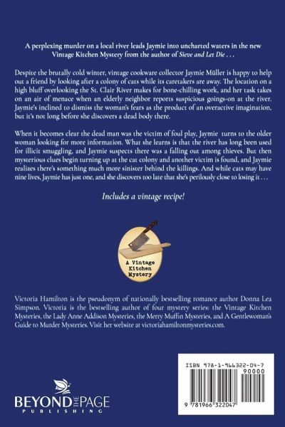A perplexing murder on a local river leads Jaymie into uncharted waters in the new Vintage Kitchen Mystery from the author of Sieve and Let Die . . .Despite the brutally cold winter, vintage cookware collector Jaymie Müller is happy to help out a friend by looking after a colony of cats while its caretakers are away. The location on a high bluff overlooking the St. Clair River makes for bone-chilling work, and her task takes on an air of menace when an elderly neighbor reports suspicious goings-on at the river. Jaymie's inclined to dismiss the woman's fears as the product of an overactive imagination, but it's not long before she discovers a dead body there. When it becomes clear the dead man was the victim of foul play, Jaymie turns to the older woman looking for more information. What she learns is that the river has long been used for illicit smuggling, and Jaymie suspects there was a falling out among thieves. But then mysterious clues begin turning up at the cat colony and another victim is found, and Jaymie realizes there's something much more sinister behind the killings. And while cats may have nine lives, Jaymie has just one, and she discovers too late that she's perilously close to losing it . . .Includes a vintage recipe!Praise for the Vintage Kitchen Mysteries:"All the right ingredients . . . Small-town setting, kitchen antiques . . . and a bowlful of mystery. A perfect recipe." -New York Times bestselling author Susan Wittig Albert"[A] charming series." -New York Times bestselling author Sheila Connolly"I have loved this series from the first book . . . it's like returning to a favorite nook for a cup of tea. It will delight, entice, and drive a reader to want to solve the murder." -Goodreads on No Grater Danger"A chilling whodunit." -Richmond Times-Dispatch"Well-plotted with several unexpected twists and more developed characters." -The Mystery Reader"Jaymie is a great character . . . She is inquisitive and full of surprises!" -Debbie's Book Bag