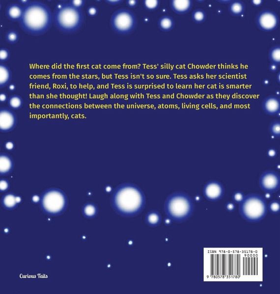 Where did the first cat come from? Tess' silly cat Chowder thinks he comes from the stars, but Tess isn't so sure. Tess asks her scientist friend, Roxi, to help, and Tess is surprised to learn her cat is smarter than she thought! Laugh along with Tess and Chowder as they discover the connections between the universe, atoms, living cells, and most importantly, cats.