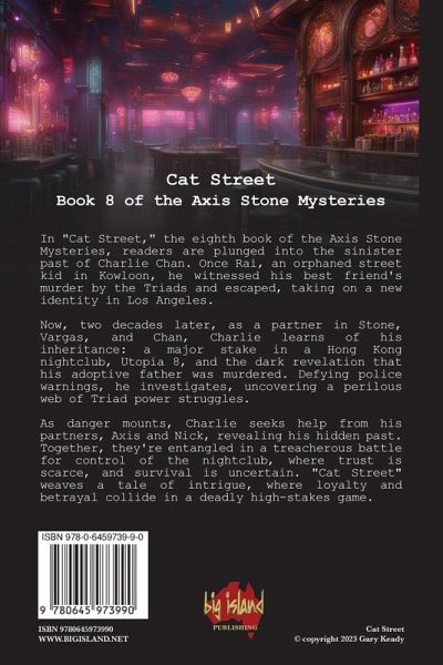In "Cat Street," the eighth book of the Axis Stone Mysteries, readers are plunged into the sinister past of Charlie Chan. Once Rai, an orphaned street kid in Kowloon, he witnessed his best friend's murder by the Triads and escaped, taking on a new identity in Los Angeles. Now, two decades later, as a partner in Stone, Vargas, and Chan, Charlie learns of his inheritance: a major stake in a Hong Kong nightclub, Utopia 8, and the dark revelation that his adoptive father was murdered. Defying police warnings, he investigates, uncovering a perilous web of Triad power struggles. As danger mounts, Charlie seeks help from his partners, Axis and Nick, revealing his hidden past. Together, they're entangled in a treacherous battle for control of the nightclub, where trust is scarce, and survival is uncertain. "Cat Street" weaves a tale of intrigue, where loyalty and betrayal collide in a deadly high-stakes game.