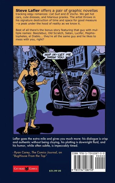Steve Lafler collects a pair of graphic novellas in Cat Suit, tracking edgy romances-we get hot cars, cute dresses, and snappy reparté. Lafler throws in his signature deconstruction of time and space, a peak under the hood of reality as we know it. Oh-and of course a cameo by the Devil himself. Cat Suit What kind of whack job would put on a mask and a skin-tight suit and head out into the city after midnight? I mean, what is our man "Steve" really up to? What pathology, what proclivity are we dealing with here? Is he fighting crime? Hell no, he's just going clubbing-and he's frankly perplexed when the bar flies & drunks want to pick a fight with him. El Diablito Call him what you like: Beezlebub, Old Scratch, Satan, Lucifer, Mephistopheles, el Diablo... it's the same guy and he likes to mess with you, right? Or maybe he's just misunderstood? Could it be he knows something they're trying to hide from you, some important bit of knowledge and know-how? El Vocho The action starts with a fender bender between Rosa's classic '63 Impala low rider, and Eddie's beat up vintage VW Bug. BAM-it's the spark for an unlikely urban romance. Can laconic Eddie, the bohemian artist, endure the good-natured jabs from Rosa, the brilliant Latina hottie mechanic/inventor? Can they even survive when big oil sends out mobsters in pursuit of Rosa and her clean energy designs?