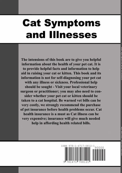 The intensions of this book are to give you helpful information about the health of your pet cat. It is to provide helpful facts and information to help aid in raising your cat or kitten. This book and its information is not for self-diagnosing your pet cat with any illness or sickness. Professional help should be sought - Visit your local veterinary surgeon or practitioner; you may also need to consider whether your pet cat or kitten should be taken to a cat hospital. Be warned vet bills can be very costly, we strongly recommend the purchase of pet insurance before health problems occur. Cat health insurance is a must as Cat illness can be very expensive; insurance will give much needed help in affording health related bills.