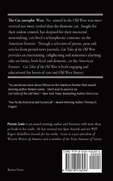 The Cat-astrophic West: No animal in the Old West was more revered nor more reviled than the domestic cat. Sought for their rodent control, but despised for their nocturnal noisemaking, cats lived a schizophrenic existence on the American frontier. In Cat Tales of the Old West, Spur Award-winning author Preston Lewis brings pioneer pussycats into the light of modern America with a collection of amusing and eclectic excerpts from dozens of frontier newspapers reporting on cats West of the Mississippi River. Through a selection of poems, puns and articles from period news journals, Cat Tales of the Old West provides an entertaining, enlightening and sometime alarming take on kitties, both feral and domestic in the West. Cat Tales of the Old West is both engaging and educational for lovers of cats and Old West history.