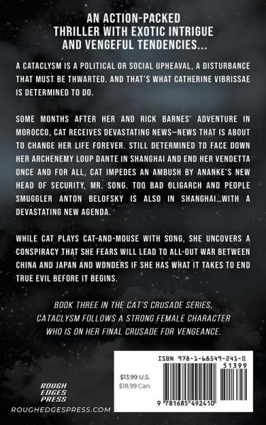 An action-packed thriller with exotic intrigue and vengeful tendencies... A cataclysm is a political or social upheaval, a disturbance that must be thwarted. And that's what Catherine Vibrissae is determined to do. Some months after her and Rick Barnes' adventure in Morocco, Cat receives devastating news-news that is about to change her life forever. Still determined to face down her archenemy Loup Dante in Shanghai and end her vendetta once and for all, Cat impedes an ambush by Ananke's new head of security, Mr. Song. Too bad oligarch and people smuggler Anton Belofsky is also in Shanghai...with a devastating new agenda. While Cat plays cat-and-mouse with Song, she uncovers a conspiracy that she fears will lead to all-out war between China and Japan and wonders if she has what it takes to end true evil before it begins. Book three in the Cat's Crusade series, Cataclysm follows a strong female character who is on her final crusade for vengeance.