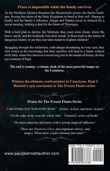 Peace is impossible while the family survives As the Northern Alliance threatens the Stormwind's power, the family retaliates, forcing the rulers of the Petty Kingdoms to bend to their will. Hoping to finally end the family's influence, Athgar and Natalia travel to Abelard for a secret meeting, striking a deal for the future of Therengia. With a bold plan to destroy the Volstrum, they must cross Zaran, where the brave vanish and the foolhardy lose their minds. Is there truth in the stories of dangerous beasts, or are they just tales meant to frighten children? Struggling through the wilderness, with danger threatening at every turn, they seek solace in the knowledge that their sacrifice will lead to a future without strife Only when they discover a secret long lost to the annals of history do they see a beacon of hope. The end is coming-a titanic clash of the most powerful mages on the Continent. Witness the ultimate confrontation in Cataclysm, Paul J Bennett's epic conclusion to The Frozen Flame series. New to the series? Get to know Athgar and Natalia in their origin stories, Into the Fire & The Awakening, then pick up Book One: Ashes to learn how they met!