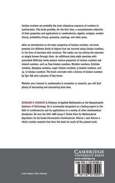 Catalan numbers are probably the most ubiquitous sequence of numbers in mathematics. This book gives for the first time a comprehensive collection of their properties and applications to combinatorics, algebra, analysis, number theory, probability theory, geometry, topology, and other areas. Following an introduction to the basic properties of Catalan numbers, the book presents 214 different kinds of objects counted by them in the form of exercises with solutions. The reader can try solving the exercises or simply browse through them. Some 68 additional exercises with prescribed difficulty levels present various properties of Catalan numbers and related numbers, such as Fuss-Catalan numbers, Motzkin numbers, Schröder numbers, Narayana numbers, super Catalan numbers, q-Catalan numbers and (q,t)-Catalan numbers. The book ends with a history of Catalan numbers by Igor Pak and a glossary of key terms. Whether your interest in mathematics is recreation or research, you will find plenty of fascinating and stimulating facts here.