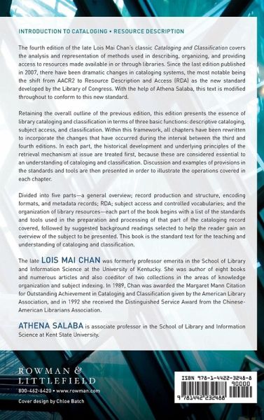 The fourth edition of the late Lois Mai Chan's classic Cataloging and Classification covers the analysis and representation of methods used in describing, organizing, and providing access to resources made available in or through libraries. Completely updated to incorporate the changes that have occurred during the interval between the third and fourth editions, this book is the standard text for the teaching and understanding of cataloging and classification.
