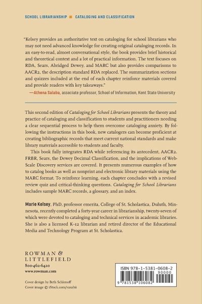 Cataloging for School Librarians, Second Editionpresents the theory and practice of cataloging and classification to students and practitioners needing a clear sequential process to help them overcome cataloging anxiety. Each chapter features a review quiz and critical thinking questions. It includes sample full MARC records and a glossary.
