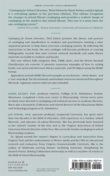 Marie Kelsey, Ph.D., professor emerita, College of St. Scholastica, Duluth, Minnesota, recently completed a forty-year career in librarianship, twenty-seven of which were devoted to cataloging and technical services in academic libraries. She is also a licensed K-12 librarian and retired director of the Educational Media and Technology program at St. Scholastica. Dr. Kelsey earned her master's degree in English at Bemidji State University and her master's and Ph.D. degrees in Library Science from the University of Wisconsin, Madison. She has authored several articles on cataloging and other aspects of school librarianship. In 2006, her book Ulysses S. Grant, A Bibliography (Praeger, 2005) was named one of the five best bibliographies of the year in history by the Reference & User Services Association (ALA) History Section's Bibliography and Indexes Committee. Jen Spisak, Ph.D., assistant professor, Longwood University, has spent over two decades in the field of education with experience as a teacher, school librarian, and assistant professor. She has previously been honored as her school's Teacher of the Year and as the Virginia Association of School Librarians School Librarian of the Year. She currently teaches cataloging to school librarianship students. Dr. Spisak earned her master's degree in Curriculum and Instruction and her endorsement in Library Media and her Ph.D. in Educational Research and Evaluation from Virginia Commonwealth University. She is the author of Multimedia Learning Stations: Facilitating Instruction, Strengthening the Research Process, Building Collaborative Partnerships as well asa number of articles in the field of school librarianship.