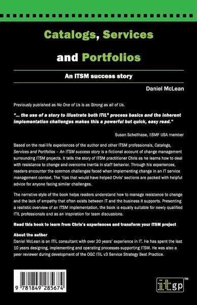 Previously published as No One of Us is as Strong as all of Us. ""... the use of a story to illustrate both ITIL® process basics and the inherent implementation challenges makes this a powerful but quick, easy read."" Susan Schellhase, itSMF USA member Based on the real-life experiences of the author and other ITSM professionals, Catalogs, Services and Portfolios - An ITSM success story is a fictional account of change management surrounding ITSM projects. It tells the story of ITSM practitioner Chris as he learns how to deal with resistance to change and overcome inertia in staff behavior. Through his experiences, readers encounter the common challenges faced when implementing change in an IT service management context. The 'tips that would have helped Chris' sections are packed with helpful advice for anyone facing similar challenges. The narrative style of the book helps readers understand how to manage resistance to change and the lack of empathy that often exists between IT and the business it supports. Presenting a realistic overview of an ITSM implementation, the book is equally suitable for newly qualified ITIL professionals and as an inspiration for team discussions. Read this book to learn from Chris's experiences and transform your ITSM project About the author Daniel McLean is an ITIL consultant with over 20 years' experience in IT. He has spent the last 10 years designing, implementing and operating processes supporting ITSM. He was also a peer reviewer during development of the OGC ITIL v3 Service Strategy Best Practice.