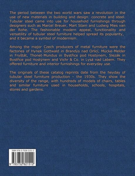 The period between the two world wars saw a revolution in the use of new materials in building and design: concrete and steel. Tubular steel came into use for household furnishings through designers such as Marcel Breuer, Mart Stam and Ludwig Mies van der Rohe. Maximum utility, simple, clear forms and low price levels were considered the essentials of well-designed consumer goods. The fashionable modern appeal, functionality and versatility of tubular steel furniture helped spread its popularity, and it became a symbol of modernism.Among the major Czech producers of metal furniture were the factories of Hynek Gottwald, Mücke-Melder, Thonet-Mundus, Slezák and Vichr & Co. They offered furniture and interior furnishings for everyday use.The originals of these catalog reprints date from the heyday of tubular steel furniture production: the 1930s. They show the diversity of the range, with hundreds of models of chairs, tables and similar furniture used in households, schools, hospitals, stores and gardens.5 catalogs, 184 pages