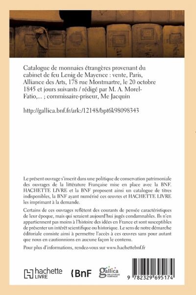 Catalogue de monnaies étrangères provenant du cabinet de feu Lenig de Mayence: vente, Paris, Alliance des Arts, 178 rue Montmartre, le 20 octobre 1845 et jours suivants / rédigé par M. A. Morel-Fatio, ...; commissaire-priseur, Me Jacquin Date de l'édition originale: 1845 Le présent ouvrage s'inscrit dans une politique de conservation patrimoniale des ouvrages de la littérature Française mise en place avec la BNF. HACHETTE LIVRE et la BNF proposent ainsi un catalogue de titres indisponibles, la BNF ayant numérisé ces oeuvres et HACHETTE LIVRE les imprimant à la demande. Certains de ces ouvrages reflètent des courants de pensée caractéristiques de leur époque, mais qui seraient aujourd'hui jugés condamnables. Ils n'en appartiennent pas moins à l'histoire des idées en France et sont susceptibles de présenter un intérêt scientifique ou historique. Le sens de notre démarche éditoriale consiste ainsi à permettre l'accès à ces oeuvres sans pour autant que nous en cautionnions en aucune façon le contenu. Pour plus d'informations, rendez-vous sur www.hachettebnf.fr
