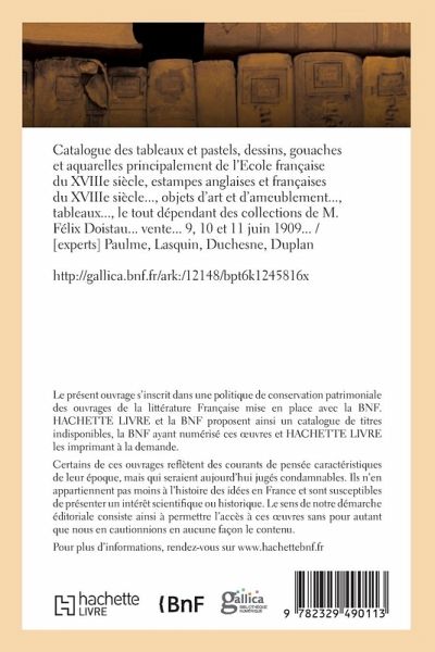Catalogue des tableaux et pastels, dessins, gouaches et aquarelles principalement de l'Ecole française du XVIIIe siècle, estampes anglaises et françaises du XVIIIe siècle..., objets d'art et d'ameublement..., tableaux..., le tout dépendant des collections de M. Félix Doistau... vente... 9, 10 et 11 juin 1909... / [experts] Paulme, Lasquin, Duchesne, Duplan Date de l'édition originale: 1909 Le présent ouvrage s'inscrit dans une politique de conservation patrimoniale des ouvrages de la littérature Française mise en place avec la BNF. HACHETTE LIVRE et la BNF proposent ainsi un catalogue de titres indisponibles, la BNF ayant numérisé ces oeuvres et HACHETTE LIVRE les imprimant à la demande. Certains de ces ouvrages reflètent des courants de pensée caractéristiques de leur époque, mais qui seraient aujourd'hui jugés condamnables. Ils n'en appartiennent pas moins à l'histoire des idées en France et sont susceptibles de présenter un intérêt scientifique ou historique. Le sens de notre démarche éditoriale consiste ainsi à permettre l'accès à ces oeuvres sans pour autant que nous en cautionnions en aucune façon le contenu. Pour plus d'informations, rendez-vous sur www.hachettebnf.fr