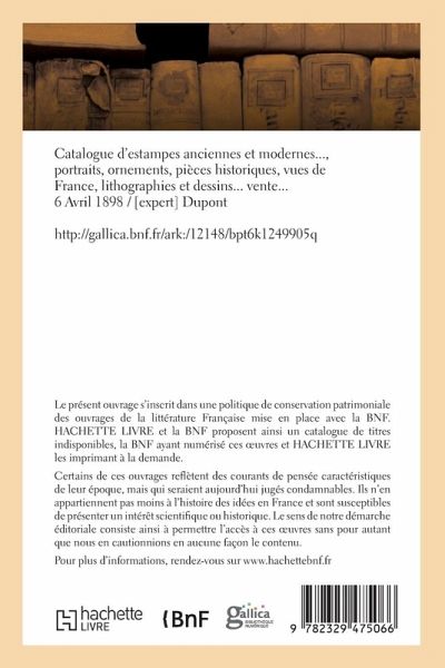 Catalogue d'estampes anciennes et modernes..., portraits, ornements, pièces historiques, vues de France, lithographies et dessins... vente... 6 Avril 1898 / [expert] Dupont Date de l'édition originale: 1898 Le présent ouvrage s'inscrit dans une politique de conservation patrimoniale des ouvrages de la littérature Française mise en place avec la BNF. HACHETTE LIVRE et la BNF proposent ainsi un catalogue de titres indisponibles, la BNF ayant numérisé ces oeuvres et HACHETTE LIVRE les imprimant à la demande. Certains de ces ouvrages reflètent des courants de pensée caractéristiques de leur époque, mais qui seraient aujourd'hui jugés condamnables. Ils n'en appartiennent pas moins à l'histoire des idées en France et sont susceptibles de présenter un intérêt scientifique ou historique. Le sens de notre démarche éditoriale consiste ainsi à permettre l'accès à ces oeuvres sans pour autant que nous en cautionnions en aucune façon le contenu. Pour plus d'informations, rendez-vous sur www.hachettebnf.fr