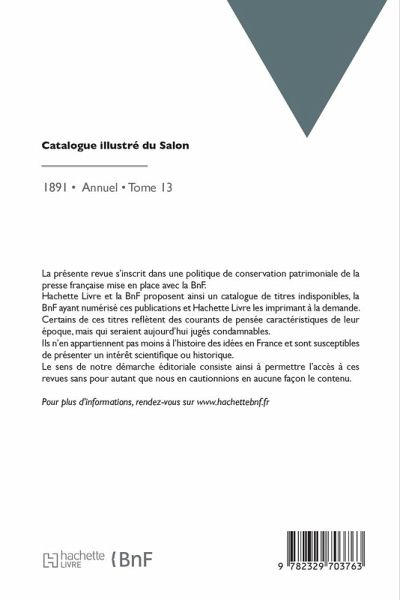 Catalogue illustré du Salon... / publié sous la direction de F.-G. Dumas Date de l'édition originale: 1891 La présente revue s'inscrit dans une politique de conservation patrimoniale de la presse française mise en place avec la BnF. Hachette Livre et la BnF proposent ainsi un catalogue de titres indisponibles, la BnF ayant numérisé ces publications et Hachette Livre les imprimant à la demande. Certains de ces titres reflètent des courants de pensée caractéristiques de leur époque, mais qui seraient aujourd'hui jugés condamnables. Ils n'en appartiennent pas moins à l'histoire des idées en France et sont susceptibles de présenter un intérêt scientifique ou historique. Le sens de notre démarche éditoriale consiste ainsi à permettre l'accès à ces revues sans pour autant que nous en cautionnions en aucune façon le contenu. Pour plus d'informations, rendez-vous sur www.hachettebnf.fr