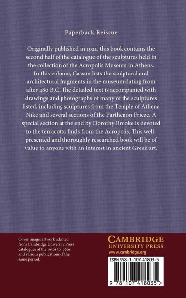 Originally published in 1921, this book contains the second half of the catalogue of the sculptures held in the collection of the Acropolis Museum in Athens. In this volume, Casson lists the sculptural and architectural fragments in the museum dating from after 480 BC. The detailed text is accompanied with drawings and photographs of many of the sculptures listed, including sculptures from the Temple of Athena Nike and several sections of the Parthenon Frieze. A special section at the end by Dorothy Brooke is devoted to the terracotta finds from the Acropolis. This well-presented and thoroughly researched book will be of value to anyone with an interest in ancient Greek art.