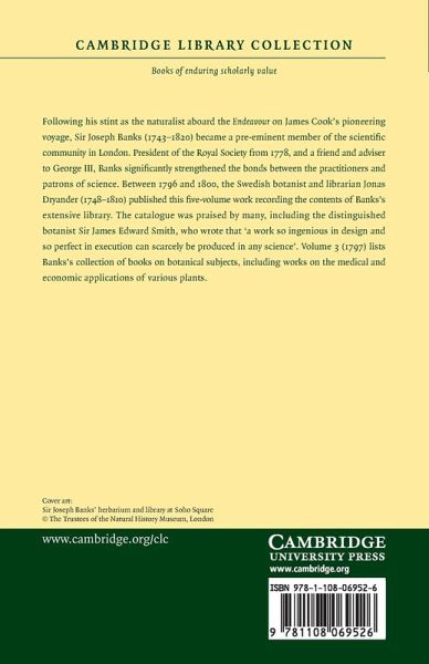 Following his stint as the naturalist aboard the Endeavour on James Cook's pioneering voyage, Sir Joseph Banks (1743-1820) became a pre-eminent member of the scientific community in London. President of the Royal Society from 1778, and a friend and adviser to George III, Banks significantly strengthened the bonds between the practitioners and patrons of science. Between 1796 and 1800, the Swedish botanist and librarian Jonas Dryander (1748-1810) published this five-volume work recording the contents of Banks' extensive library. The catalogue was praised by many, including the distinguished botanist Sir James Edward Smith, who wrote that 'a work so ingenious in design and so perfect in execution can scarcely be produced in any science'. Volume 3 (1797) lists Banks' collection of books on botanical subjects, including works on the medical and economic applications of various plants.