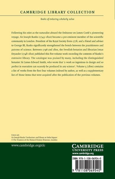 Following his stint as the naturalist aboard the Endeavour on James Cook's pioneering voyage, Sir Joseph Banks (1743-1820) became a pre-eminent member of the scientific community in London. President of the Royal Society from 1778, and a friend and adviser to George III, Banks significantly strengthened the bonds between the practitioners and patrons of science. Between 1796 and 1800, the Swedish botanist and librarian Jonas Dryander (1748-1810) published this five-volume work recording the contents of Banks' extensive library. The catalogue was praised by many, including the distinguished botanist Sir James Edward Smith, who wrote that 'a work so ingenious in design and so perfect in execution can scarcely be produced in any science'. Volume 5 (1800) contains a list of works from the first four volumes indexed by author, as well as a supplementary list of those items that were acquired after the publication of the previous volumes.