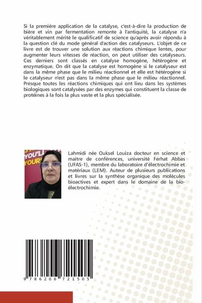 Si la première application de la catalyse, c'est-à-dire la production de bière et vin par fermentation remonte à l'antiquité, la catalyse n'a véritablement mérité le qualificatif de science qu'après avoir répondu à la question clé du mode général d'action des catalyseurs. L'objet de ce livre est de trouver une solution aux réactions chimique lentes, pour augmenter leurs vitesses de réaction, on peut utiliser des catalyseurs. Ces derniers sont classés en catalyse homogène, hétérogène et enzymatique. On dit que la catalyse est homogène si le catalyseur est dans la même phase que le milieu réactionnel et elle est hétérogène si le catalyseur n'est pas dans la même phase que le milieu réactionnel. Presque toutes les réactions chimiques qui ont lieu dans les systèmes biologiques sont catalysées par des enzymes qui constituent la classe de protéines à la fois la plus vaste et la plus spécialisée.