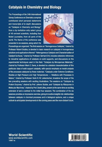 The Proceedings of the 24th International Solvay Conference on Chemistry comprise contributed short personal statements and transcripts of in-depth discussions on "Catalysis in Chemistry and Biology" from a by-invitation-only select group of 48 eminent scientists, including four Nobel Laureates, from all parts of the world. The theme of the conference was presented in six sessions, along which the Proceedings are organized. The first session on "Homogeneous Catalysis," chaired by Professor Robert Grubbs, is devoted to basic research on catalysis in homogeneous solutions and applications thereof. "Heterogeneous Catalysis and Characterization of Catalyst Surfaces," chaired by Professor Gerhard Ertl, includes extensive references to industrial applications of catalysis on solid supports, and discussions on the experimental techniques used in this field. "Catalysis by Microporous Materials," chaired by Professor Mark E. Davis, is devoted to a detailed characterization of this particular class of solid support catalysts, with special emphasis on model analysis of the processes catalyzed by these materials. "Catalysis under Extreme Conditions: Studies at High Pressure and High Temperatures - Relations with Processes in Nature," chaired by Professor Henk N W Lekkerkerker, broadens the scope of the two preceding sessions with exciting illustrations. The sessions on "Catalysis by Protein Enzymes," chaired by Prof. JoAnne Stubbe, and "Catalysis by Ribozymes in Molecular Machines," chaired by Prof. David Lilley, present at the same time an exciting extension of and a contrast to the initial four sessions. The combination of the six sessions provides an impressive overview, giving innovative insights into relationships between catalysis in chemical processes and in biological systems, and a unique outlook to anticipated developments in the coming years and the more distant future.