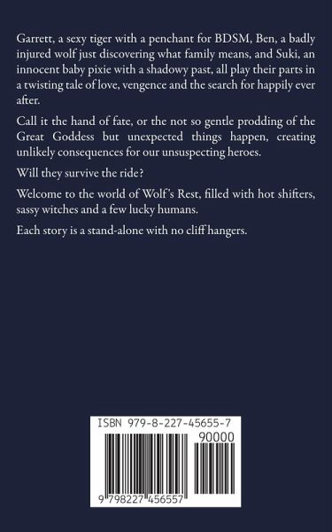 Garrett, a sexy tiger with a penchant for BDSM, Ben, a badly injured wolf just discovering what family means, and Suki, an innocent baby pixie with a shadowy past, all play their parts in a twisting tale of love, vengence and the search for happily ever after. Call it the hand of fate, or the not so gentle prodding of the Great Goddess but unexpected things happen, creating unlikely consequences for our unsuspecting heroes. Will they survive the ride? Welcome to the world of Wolf's Rest, filled with hot shifters, sassy witches and a few lucky humans. Each story is a stand-alone with no cliff hangers.