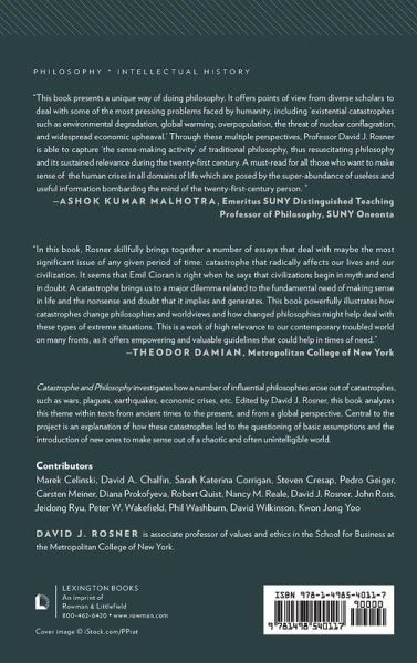 Introductory Essay: Catastrophe and the Limits of Understanding, by David J. Rosner Part I: The Ancient World Catastrophe and Enlightenment: The Genesis of Buddhism's First Noble Truth, by JeiDong Ryu The Missing God: Voices of Despair and Empathy in the Book of Lamentations, by Sarah K. Corrigan Patterns of Post-Catastrophic Thought in Ancient China: The Growth of Philosophy after the Warring States Period, by Kwon Jong Yoo Athens in Ruins: Plato and the Aftermath of the Peloponnesian War, by John Ross Part II: The Middle Ages/Renaissance Augustine's Anti-Catastrophe, by Steven Cresap Values in the Time of Plague: Civilizational Trauma and Moral Nihilism in Boccaccio's Decameron, by David J. Rosner The Search for Stability in Chaotic Times: Machiavelli, by Diana Prokofyeva Part III: Modernity I: Early Modern Period Three Catastrophes and One Philosopher: Atrocious Wars, and the Political Ideas of Thomas Hobbes, by David Wilkinson "A New Philosophy Calls All into Doubt": The Epistemo