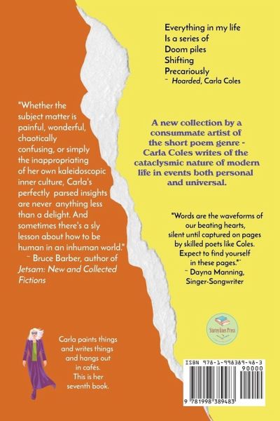Everything in my life Is a series of Doom piles Shifting Precariously. Hoarded, Carla Coles A new collection by a consummate artist of the short poem genre: Carla Coles writes of the cataclysmic nature of modern life in events both personal and universal. Change. All my settings have been changed. I needed help navigating the changes And for once in my life I listened. I listened to my body when it needed rest. I listened to my doctors. I listened to my friends And I listened to my therapist. And I listened when we were mucking through a session and she told me I jump to catastrophic conclusions. I heard her and responded with, "That's a great name for a book." - face palm - Yes, friends, I have a lot of work to do. Thanks for taking this journey with me.