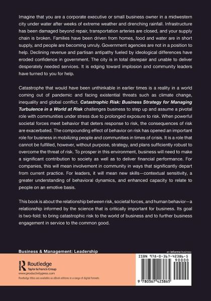 Imagine that you are a corporate executive or small business owner in a midwestern city under water after weeks of extreme weather and drenching rainfall. Infrastructure has been damaged beyond repair, transportation arteries are closed, and your supply chain is broken. Families have been driven from homes, food and water are in short supply, and people are becoming unruly. Government agencies are not in a position to help. Declining revenue and partisan antipathy fueled by ideological differences have eroded confidence in government. The city is in total disrepair and unable to deliver desperately needed services. It is edging toward implosion and community leaders have turned to you for help. Catastrophe that would have been unthinkable in earlier times is a reality in a world coming out of pandemic and facing existential threats such as climate change, inequality and global conflict. Catastrophic Risk: Business Strategy for Managing Turbulence in a World at Risk challenges business to step up and assume a pivotal role with communities under stress due to prolonged exposure to risk. When powerful societal forces meet behavior that deters response to risk, the consequences of risk are exacerbated. The compounding effect of behavior on risk has opened an important role for business in mobilizing people and communities in times of crisis. It is a role that cannot be fulfilled, however, without purpose, strategy and plans sufficiently robust to overcome the threat of risk. To prosper in this environment, business will need to make a significant contribution to society as well as to deliver financial performance. For companies, this will mean involvement in community in ways that significantly depart from current practice. For leaders, it will mean new skills-contextual sensitivity, a greater understanding of behavioral dynamics, and enhanced capacity to relate to people on an emotive basis. This book is about the relationship between risk, societal forces and human behavior-a relationship informed by the sciences that is critically important for business. Its goal is two-fold: to bring catastrophic risk to the world of business and to further business engagement in service to the common good.