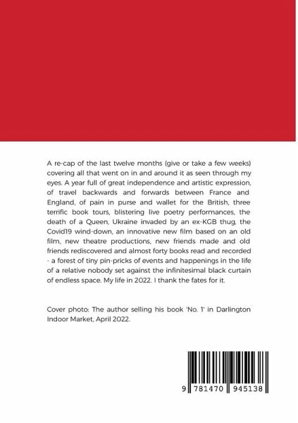 A re-cap of the last twelve months (give or take a few weeks) covering all that went on in and around it as seen through my eyes. A year full of great independence and artistic expression, of travel backwards and forwards between France and England, of pain in purse and wallet for the British, three terrific book tours, blistering live poetry performances, the death of a Queen, Ukraine invaded by an ex-KGB thug, the Covid19 wind-down, an innovative new film based on an old film, new theatre productions, new friends made and old friends rediscovered and almost forty books read and recorded - a forest of tiny pin-pricks of events and happenings in the life of a relative nobody set against the infinitesimal black curtain of endless space. My life in 2022. I thank the fates for it.