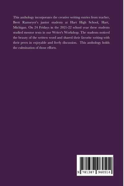 This anthology incorporates the creative writing entries from teacher, Brett Ramseyer's junior students at Hart High School, Hart, Michigan. On 24 Fridays in the 2021-22 school year these students studied mentor texts in our Writer's Workshop. The students noticed the beauty of the written word and shared their favorite writing with their peers in enjoyable and lively discussion. This anthology holds the culmination of those efforts.