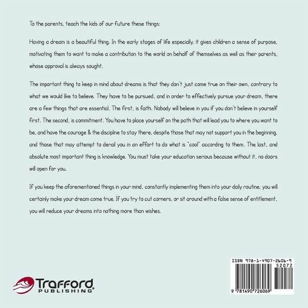 Having a dream is a beautiful thing. In the early stages of life especially, it gives children a sense of purpose, motivating them to want to make a contribution to the world on behalf of themselves as well as their parents, whose approval is always sought. The important thing to keep in mind about dreams is that they don¿t just come true on their own, contrary to what we would like to believe. They have to be pursued, and in order to effectively pursue your dream, there are a few things that are essential. The first, is faith. Nobody will believe in you if you don¿t believe in yourself first. The second, is commitment. You have to place yourself on the path that will lead you to where you want to be, and have the courage & the discipline to stay there, despite those that may not support you in the beginning, and those that may attempt to derail you in an effort to do what is ¿cool¿ according to them. The last, and absolute most important thing is knowledge. You must take your education serious because without it, no doors will open for you. If you keep the aforementioned things in your mind, constantly implementing them into your daily routine, you will certainly make your dream come true. If you try to cut corners, or sit around with a false sense of entitlement, you will reduce your dreams into nothing more than wishes.