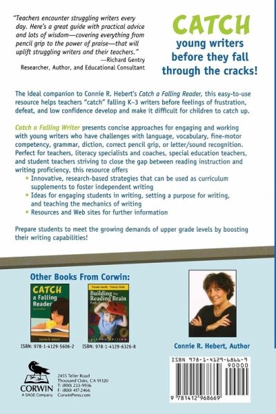 'The book pinpoints characteristic behaviors of falling writers and pairs them up with simple-to-use techniques that you can incorporate into your classroom or that parents can use at home with their children to bolster confidence and success' - Karla Bronzynski, First-Grade Teacher, Eldora-New Providence Schools, IA President, Iowa Reading Association Catch young writers before they fall through the cracks! The ideal companion to Connie Hebert's Catch a Falling Reader, this easy-to-use resource helps primary teachers "catch" falling writers before feelings of frustration, defeat, and low confidence develop, making it difficult for children to catch up. Catch a Falling Writer presents concise approaches for engaging and working with young writers who have challenges with language, vocabulary, fine-motor competency, grammar, diction, correct pencil grip, or letter/sound recognition. Perfect for teachers, literacy specialists and coaches, special education teachers, and student teachers striving to close the gap between reading instruction and writing proficiency, this resource presents: - Innovative, research-based strategies for engaging students in writing, setting a purpose for writing, and teaching the mechanics of writing - Strategies that can be used as curriculum supplements to foster independent writing - Resources and Web sites for further information