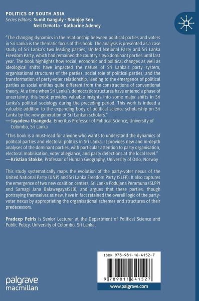 This book systematically maps the evolution of the party-voter nexus of the United National Party (UNP) and Sri Lanka Freedom Party (SLFP). In doing so, it argues that these parties rely mostly on a complex Web of patronage-based networks to mobilise electorates. They employ informal and highly dynamic, loosely knit networks as their organisational structures at the local level. They mainly focus on mobilising voters through local political actors rather than maintaining clear party bases and membership schemes. The study highlights the salience of personalities at the national as well as local levels in forming electoral support for the parties. These individuals exploit their economic, social, and cultural capital to mobilise the most efficient network that would strengthen their party during elections. The study also analyses the emergence of two new coalition centres from within these traditional parties, the Sri Lanka Podujana Peramuna (SLPP) and Samagi Jana Balawegaya (SJB), and argues that these parties, though portraying themselves as new, have in fact retained the overall logic of the party-voter nexus by appropriating the organisational schemes and structures of their predecessors.
