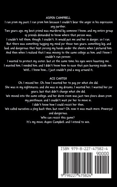 ASPEN CAMPBELL I ran from my past; I ran from him because I couldn't bear the anger in his expression any further. Two years ago, my best friend was murdered by someone I knew, and my entire group of friends demanded to know where that person was. I couldn't tell them, though. I couldn't. It would put me and her in danger, so I ran. But there was something tugging my mind for those two years, something big, and bad, and dangerous that kept forcing my hands under the sheets when I pictured him. And then when I realized that I was moving to the same college as him, and I knew I couldn't run forever. I wanted to protect my sister, but at the same time, his eyes were haunting me. I wanted him, I needed him, and I didn't know how to ease that pain burning inside me. Well... I knew how... I just couldn't find a way around it. ACE CARTER Oh, I missed her. Oh, how I wanted her to pay for what she did. She was in my nightmares, and she was in my dreams. I wanted her, I wanted her for years, but that didn't change what she did. We moved into the same college, and her dorm room was just two floors down from my penthouse, and I couldn't wait for her to move in. I didn't know how I could resist her then. We called ourselves a fling back then, but now? Oh, now it was much more. Powerful and dangerous. Who can resist this game? It's my move, Aspen Campbell, and I intend to win.