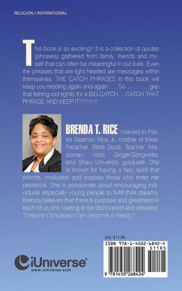 This book is so exciting!! It is a collection of quotes (phrases) gathered from family, friends and my-self that can often be meaningful in our lives. Even the phrases that are light hearted are messages within themselves. THE CATCH PHRASES in this book will keep you reading again and again..... So............grip that fishing rod tightly for a BIG CATCH... CATCH THAT PHRASE AND KEEP IT!!!!!!!!!!