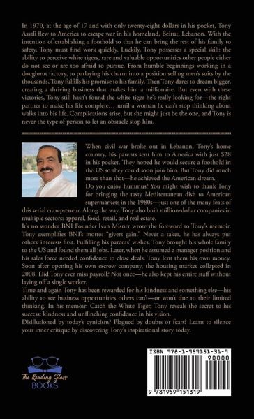 Book synopsis:In 1970, at the age of 17 and with only twenty-eight dollars in his pocket, Tony Assali flew to America to escape war in his homeland, Beirut, Lebanon. With the intention of establishing a foothold so that he can bring the rest of his family to safety, Tony must find work quickly. Luckily, Tony possesses a special skill: the ability to perceive white tigers, rare and valuable opportunities other people either do not see or are too afraid to pursue. From humble beginnings working in a doughnut factory, to parlaying his charm into a position selling men's suits by the thousands, Tony fulfills his promise to his family. Then Tony dares to dream bigger, creating a thriving business that makes him a millionaire. But even with these victories, Tony still hasn't found the white tiger he's really looking for-the right partner to make his life complete...until a woman he can't stop thinking about walks into his life. Complications arise, but she might just be the one, and Tony is never the type of person to let an obstacle stop him. Autobiography: When civil war broke out in Lebanon, Tony's home country, his parents sent him to America with just $28 in his pocket. They hoped he would secure a foothold in the US so they could soon join him. But Tony did much more than that-he achieved the American dream.Do you enjoy hummus? You might wish to thank Tony for bringing the tasty Mediterranean dish to American supermarkets in the 1980s-just one of the many feats of this serial entrepreneur. Along the way, Tony also built million-dollar companies in multiple sectors: apparel, food, retail, and real estate.It's no wonder BNI Founder Ivan Misner wrote the foreword to Tony's memoir. Tony exemplifies BNI's motto: "givers gain." Never a taker, he has always put others' interests first. Fulfilling his parents' wishes, Tony brought his whole family to the US and found them all jobs. Later, when he assumed a manager position and his sales force needed confidence to close deals, Tony lent them his own money. Soon after opening his own escrow company, the housing market collapsed in 2008. Did Tony ever miss payroll? Not once-he also kept his entire staff without laying off a single worker.Time and again Tony has been rewarded for his kindness and something else-his ability to see business opportunities others can't-or won't due to their limited thinking. In his memoir: Catch the White Tiger, Tony reveals the secret to his success: kindness and unflinching confidence in his vision.Disillusioned by today's cynicism? Plagued by doubts or fears? Learn to silence your inner critique by discovering Tony's inspirational story today.