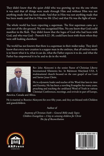 They didn't know that the quiet child who was growing up was the one whom it was said that all things were made through Him and without Him was not anything made that has been made; And that in Him was not anything made that has been made; and that in Him was life (Zoe) and that He was the light of men The whole world has been expecting a superman. The first superman came as a root out of the dry ground. No one recognized Him. No one knew that God could manifest in the flesh. They didn't know that the logos of God who had been with God, and who was God - Proverb 8:22 -30, could have been with them when they were still looking elsewhere. The world has not known that there is a superman in their midst today. They don't know that every new creation is a supper man in the embryo, that all embryo needs is to know what it is, what it can do, what the Father expects it to do, and what the Father has empowered it to be and to do in the world.