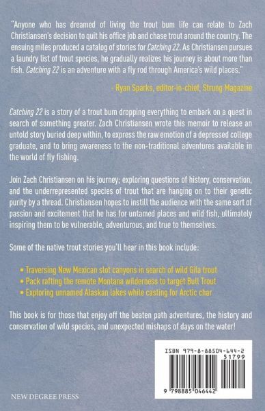 Catching 22 is a story of a trout bum dropping everything to embark on a quest in search of something greater. Zach Christiansen wrote this memoir to release an untold story buried deep within, to express the raw emotion of a depressed college graduate, and to bring awareness to the non-traditional adventures available in the world of fly fishing. Join Zach Christiansen on his journey; exploring questions of history, conservation, and the underrepresented species of trout that are hanging on to their genetic purity by a thread. Christiansen hopes to instill the audience with the same sort of passion and excitement that he has for untamed places and wild fish, ultimately inspiring them to be vulnerable, adventurous, and true to themselves. Some of the native trout stories you'll hear in this book include... Traversing New Mexican slot canyons in search of wild Gila trout. Pack rafting the remote Montana wilderness to target Bull Trout. Exploring unnamed Alaskan lakes while casting for Arctic char. This book is for those that enjoy off the beaten path adventures, the history and conservation of wild species, and unexpected mishaps of days on the water!