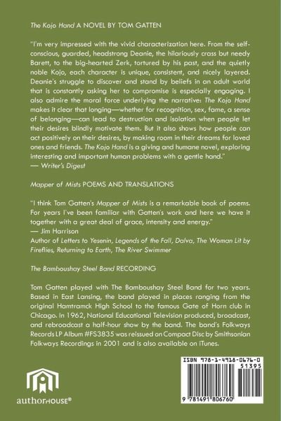 The Kojo Hand A NOVEL BY TOM GATTEN "I'm very impressed with the vivid characterization here. From the self-conscious, guarded, headstrong Deanie, the hilariously crass but needy Barett, to the big-hearted Zerk, tortured by his past, and the quietly noble Kojo, each character is unique, consistent, and nicely layered. Deanie's struggle to discover and stand by beliefs in an adult world that is constantly asking her to compromise is especially engaging. I also admire the moral force underlying the narrative: The Kojo Hand makes it clear that longing-whether for recognition, sex, fame, a sense of belonging-can lead to destruction and isolation when people let their desires blindly motivate them. But it also shows how people can act positively on their desires, by making room in their dreams for loved ones and friends. The Kojo Hand is a giving and humane novel, exploring interesting and important human problems with a gentle hand." - Writer's Digest Mapper of Mists POEMS AND TRANSLATIONS "I think Tom Gatten's Mapper of Mists is a remarkable book of poems. For years I've been familiar with Gatten's work and here we have it together with a great deal of grace, intensity and energy." - Jim Harrison Author of Letters to Yesenin, Legends of the Fall, Dalva, The Woman Lit by Fireflies, Returning to Earth, The River Swimmer The Bamboushay Steel Band RECORDING Tom Gatten played with The Bamboushay Steel Band for two years. Based in East Lansing, the band played in places ranging from the original Hamtramck High School to the famous Gate of Horn club in Chicago. In 1962, National Educational Television produced, broadcast, and rebroadcast a half-hour show by the band. The band's Folkways Records LP Album #FS3835 was reissued on Compact Disc by Smithsonian Folkways Recordings in 2001 and is also available on iTunes.