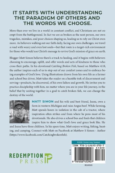 It starts with understanding the paradigm of others and the words we choose. More than ever we live in a world in constant conflict, and Christians are not exempt from the battleground. In fact, we are as broken as the next person, our own tragedies, mistakes, and poor choices shaping us, leading us to rely on Christ even more. As believers walking out our faith daily, facing our own challenges, we travel a road with weary and even lost souls-but that route is a target-rich environment for those who would use Christ's message to revive God's mission of grace on earth. Blogger Matt Simon believes there's a track to healing, and it begins with believers choosing to encourage, uplift, and offer words and acts of kindness to those who cross their paths. In his devotional Catching Broken Fish, based on Matthew 4:18, the author inspires each of us to step out of our comfort zones and to embrace being examples of God's love. Using illustrations drawn from his own life as a farmer and school bus driver, Matt takes the reader on a humble trek of discernment and serving-products, he discovered, of his own failure and growth. He invites you to practice discipleship with him, no matter where you are in your life journey, in the belief that by uniting together in a goal to catch broken fish, we can change the destiny of the world.