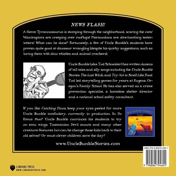 If dinosaurs moved into your neighborhood, how would you help them learn to fit in? Quirky Uncle Bunkle has plenty of whimsical advice, covering everything from catching dinos (using nets, whistles, and animal crackers), to taming them (with long walks and invitations to dinner) and ultimately making friends. Tips along the way include how to dress and be polite, and specifically who not to eat (anyone who talks, screams, squawks, rolls, or walks!)