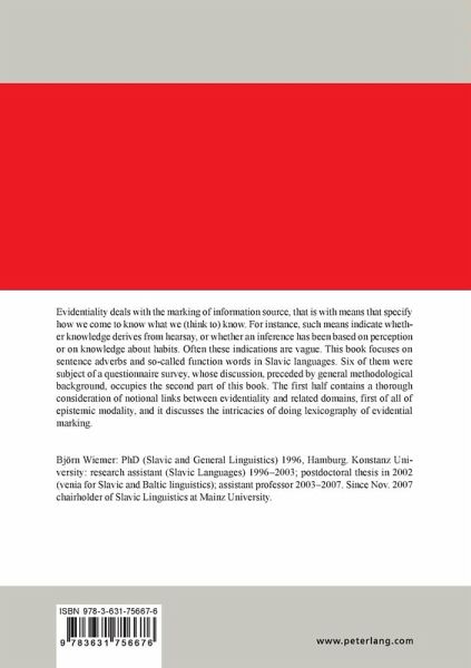 Evidentiality deals with the marking of information source, that is with means that specify how we come to know what we (think to) know. For instance, such means indicate whether knowledge derives from hearsay, or whether an inference has been based on perception or on knowledge about habits. Often these indications are vague. This book focuses on sentence adverbs and so-called function words in Slavic languages. Six of them were subject of a questionnaire survey, whose discussion, preceded by general methodological background, occupies the second part of this book. The first half contains a thorough consideration of notional links between evidentiality and related domains, first of all of epistemic modality, and it discusses the intricacies of doing lexicography of evidential marking.