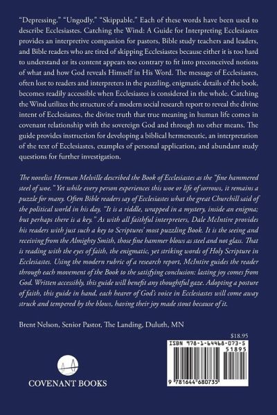 "Depressing." "Ungodly." "Skippable." Each of these words have been used to describe Ecclesiastes. Catching the Wind: A Guide for Interpreting Ecclesiastes provides an interpretive companion for pastors, Bible study teachers and leaders, and Bible readers who are tired of skipping Ecclesiastes because either it is too hard to understand or its content appears too contrary to fit into preconceived notions of what and how God reveals Himself in His Word. The message of Ecclesiastes, often lost to readers and interpreters in the puzzling, enigmatic details of the book, becomes readily accessible when Ecclesiastes is considered in the whole. Catching the Wind utilizes the structure of a modern social research report to reveal the divine intent of Ecclesiastes, the divine truth that true meaning in human life comes in covenant relationship with the sovereign God and through no other means. The guide provides instruction for developing a biblical hermeneutic, an interpretation of the text of Ecclesiastes, examples of personal application, and abundant study questions for further investigation.