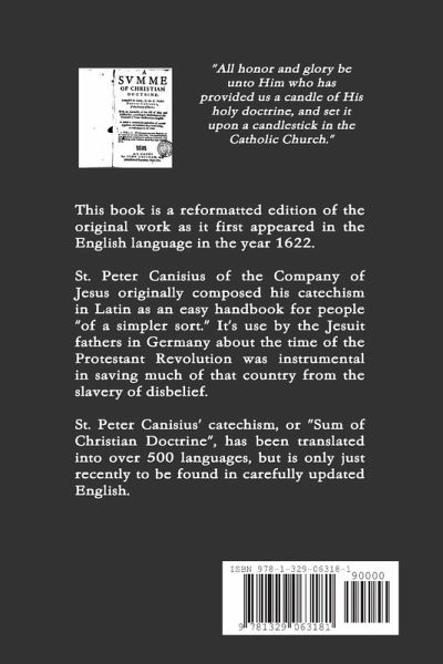This book is a reformatted edition of the original work as it first appeared in the English language in the year 1622. St. Peter Canisius of the Company of Jesus originally composed his catechism in Latin as an easy handbook for people "of a simpler sort." It's use by the Jesuit fathers in Germany during the time of the Protestant Revolution was instrumental in saving half of that country from the slavery of disbelief. St. Peter Canisius' catechism, or "Sum of Christian Doctrine", has been translated into over 500 languages, but is only just recently to be found in carefully updated, modern English.