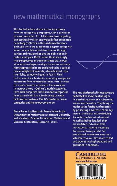 This book develops abstract homotopy theory from the categorical perspective with a particular focus on examples. Part I discusses two competing perspectives by which one typically first encounters homotopy (co)limits: either as derived functors definable when the appropriate diagram categories admit a compatible model structure, or through particular formulae that give the right notion in certain examples. Emily Riehl unifies these seemingly rival perspectives and demonstrates that model structures on diagram categories are irrelevant. Homotopy (co)limits are explained to be a special case of weighted (co)limits, a foundational topic in enriched category theory. In Part II, Riehl further examines this topic, separating categorical arguments from homotopical ones. Part III treats the most ubiquitous axiomatic framework for homotopy theory - Quillen's model categories. Here, Riehl simplifies familiar model categorical lemmas and definitions by focusing on weak factorization systems. Part IV introduces quasi-categories and homotopy coherence.
