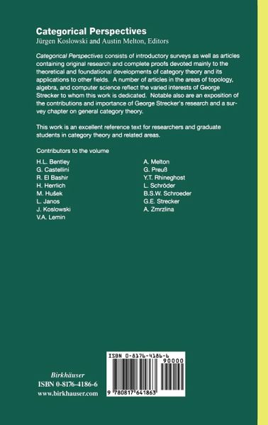 "Categorical Perspectives" consists of introductory surveys as well as articles containing original research and complete proofs devoted mainly to the theoretical and foundational developments of category theory and its applications to other fields. A number of articles in the areas of topology, algebra and computer science reflect the varied interests of George Strecker to whom this work is dedicated. Notable also are an exposition of the contributions and importance of George Strecker's research and a survey chapter on general category theory. This work is an excellent reference text for researchers and graduate students in category theory and related areas.