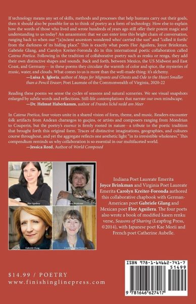 If technology means any set of skills, methods and processes that help humans carry out their goals, then it should also be possible for us to think of poetry as a form of technology. How else to explain how the words of those who lived and wrote hundreds of years ago still offer their potent magic and understanding to us today? An amazement: that we can enter into this bright chain of conversation, ranging back to when our "[a]ncient ancestors wondered who/ carried the sun" and "called it forth/ from the darkness of its hiding place." This is exactly what poets Flor Aguilera, Joyce Brinkman, Gabriele Glang, and Carolyn Kreiter-Foronda do in this international poetic collaboration called Catena Poetica. Following in the tradition of collaborative poetry such as renku or renga, they add their own distinctive shapes and sounds. Back and forth, between Mexico, the US Midwest and East Coast, and Germany- in these poems they circulate the warmth of color and spice, the mysteries of music, water, and clouds. What comes to us is more than the well-made thing: it's alchemy.-Luisa A. Igloria, author of Maps for Migrants and Ghosts and Ode to the Heart Smaller than a Pencil Eraser; Poet Laureate of the Commonwealth of Virginia, 2020-22 Reading these poems we sense the cycles of seasons and natural sceneries. We see visual snapshots enlarged by subtle words and reflections. Still-life contemplations that narrate our own mindscape.-Dr. Helmut Haberkamm, author of Frankn lichd nedd am Meer In Catena Poetica, four voices unite in a shared vision of form, theme, and music. Readers encounter folk artifacts from Andean charangos to guqins, or artists and composers ranging from Mondrian to Couperin, but the poetry's essence is firmly rooted in nature-a tribute to the poetic tradition that brought forth this original form. Traces of distinctive imaginations, geographies, and cultures course throughout, and yet the aggregate reflects one aesthetic light "in its irresistible wholeness." This compendium reminds us why collaboration is so essential in our multifaceted world.-Jessica Reed, Author of World Composed