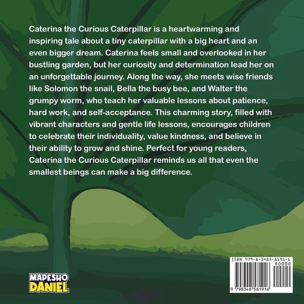 Caterina the Curious Caterpillar is a heartwarming and inspiring tale about a tiny caterpillar with a big heart and an even bigger dream. Caterina feels small and overlooked in her bustling garden, but her curiosity and determination lead her on an unforgettable journey. Along the way, she meets wise friends like Solomon the snail, Bella the busy bee, and Walter the grumpy worm, who teach her valuable lessons about patience, hard work, and self-acceptance. When a storm challenges the garden, Caterina discovers that being small can be a strength. She learns that everyone, no matter their size, has an important role to play. As Caterina transforms into a beautiful butterfly, she inspires the garden creatures to embrace their uniqueness and see their own potential. This charming story, filled with vibrant characters and gentle life lessons, encourages children to celebrate their individuality, value kindness, and believe in their ability to grow and shine. Perfect for young readers, Caterina the Curious Caterpillar reminds us all that even the smallest beings can make a big difference.
