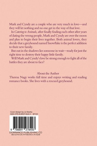Mark and Cyndy are a couple who are very much in love-and they will let nothing and no one get in the way of that love. In Catering to Animals, after finally finding each other after years of dating the wrong people, Mark and Cyndy are over the moon and plan to begin their lives together. Both animal lovers, they decide that a greyhound named Snowflake is the perfect addition to their new family. But out in the shadows lies someone in wait-ready for just the right time to destroy their happy little family. Will Mark and Cyndy's love be strong enough to fight all of the battles they are about to face? About the Author Theresa Nagy works full time and enjoys writing and reading romance books. She lives with a rescued greyhound.